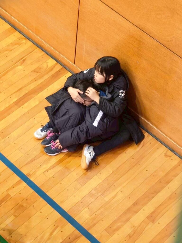 大会終了後、3年生の子、5年生の膝の上で寝てしまいました。